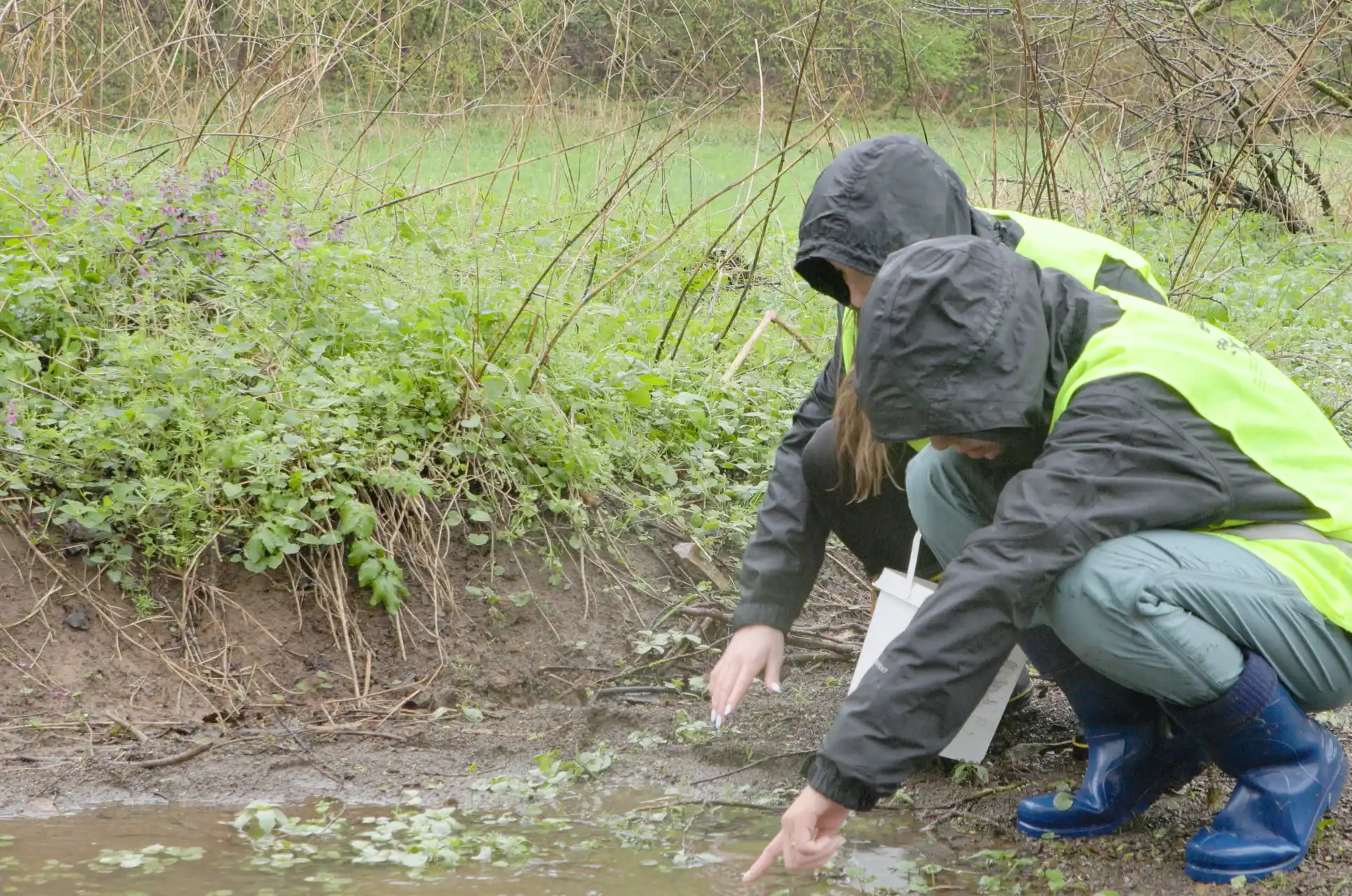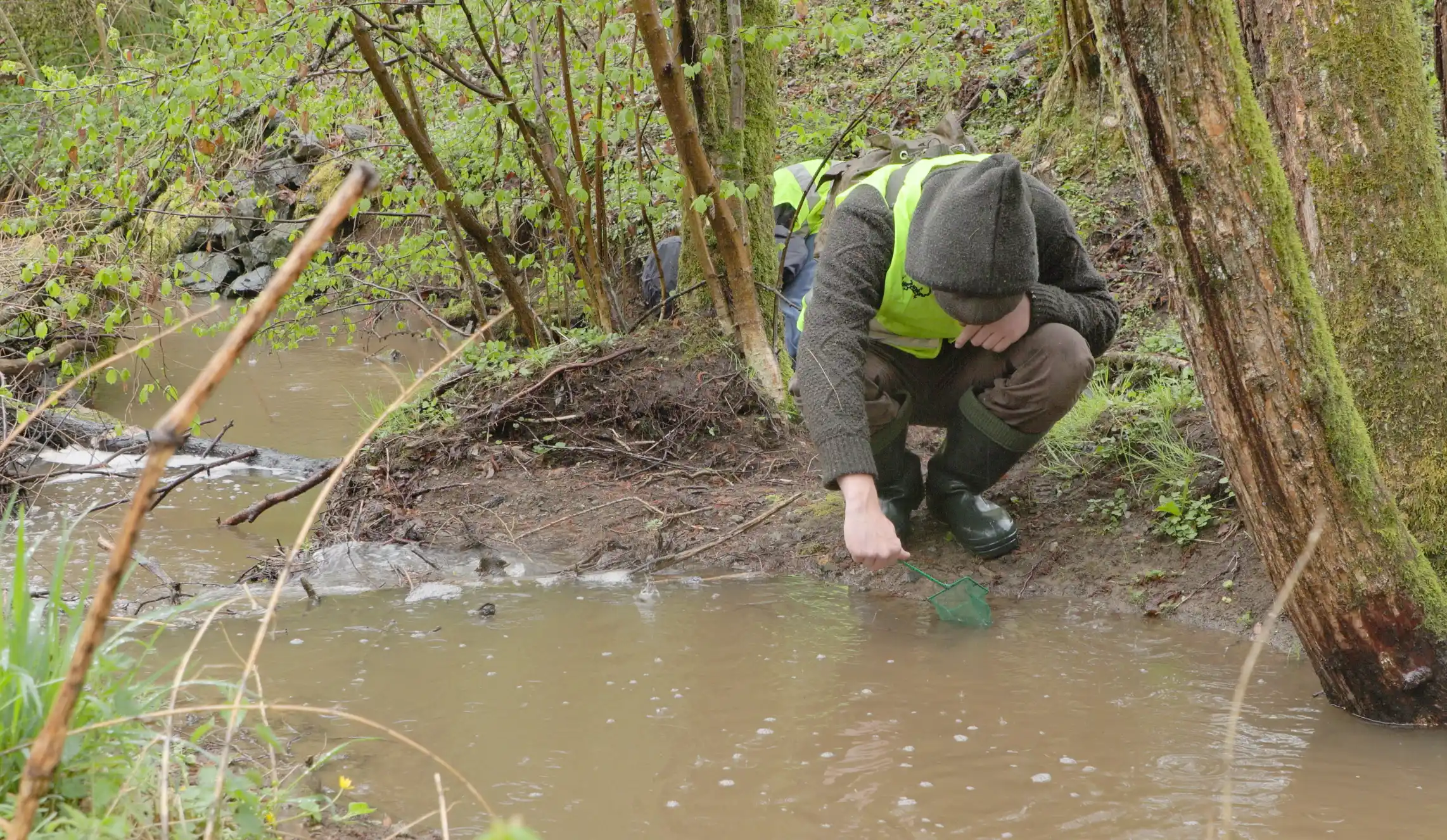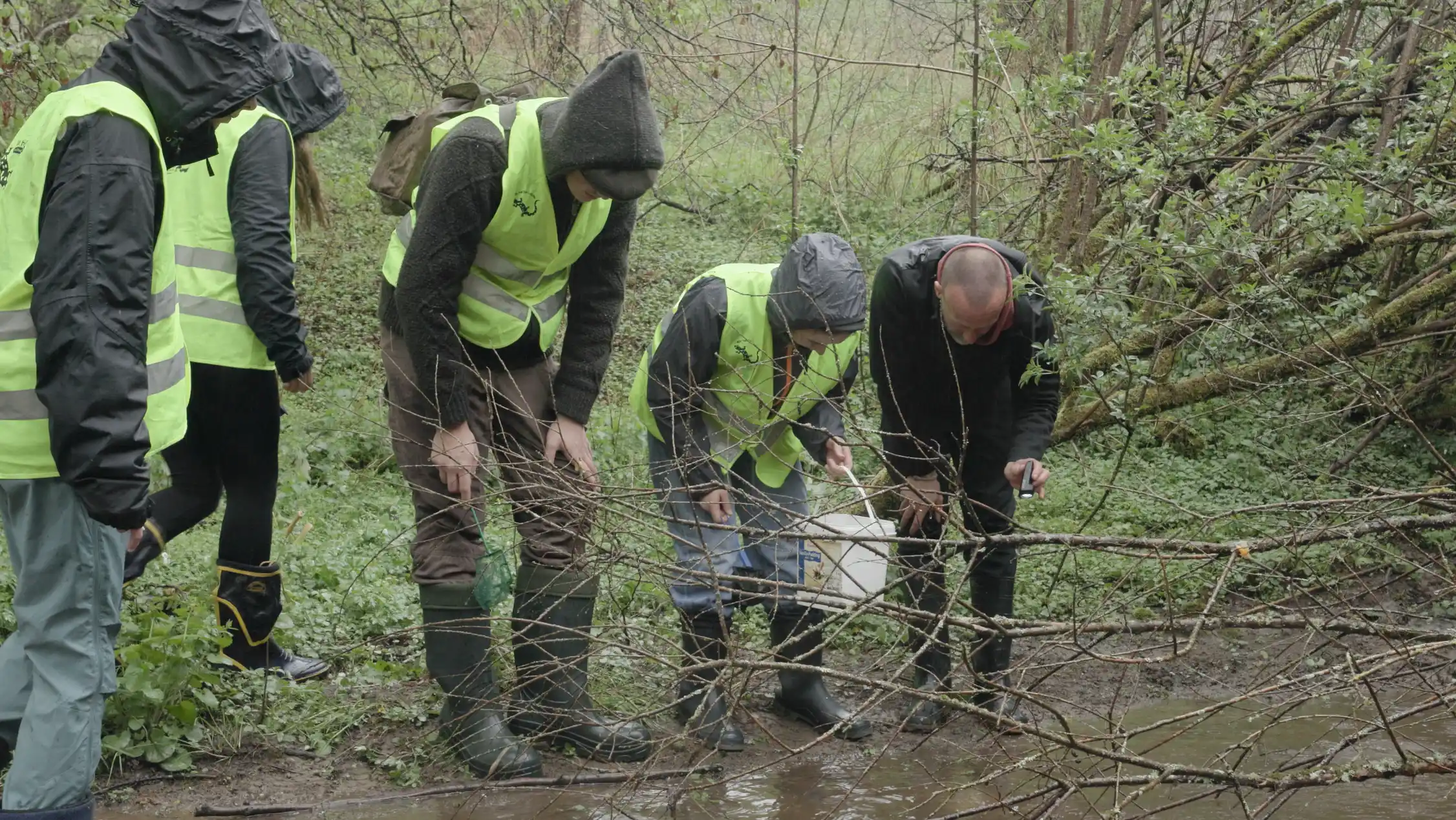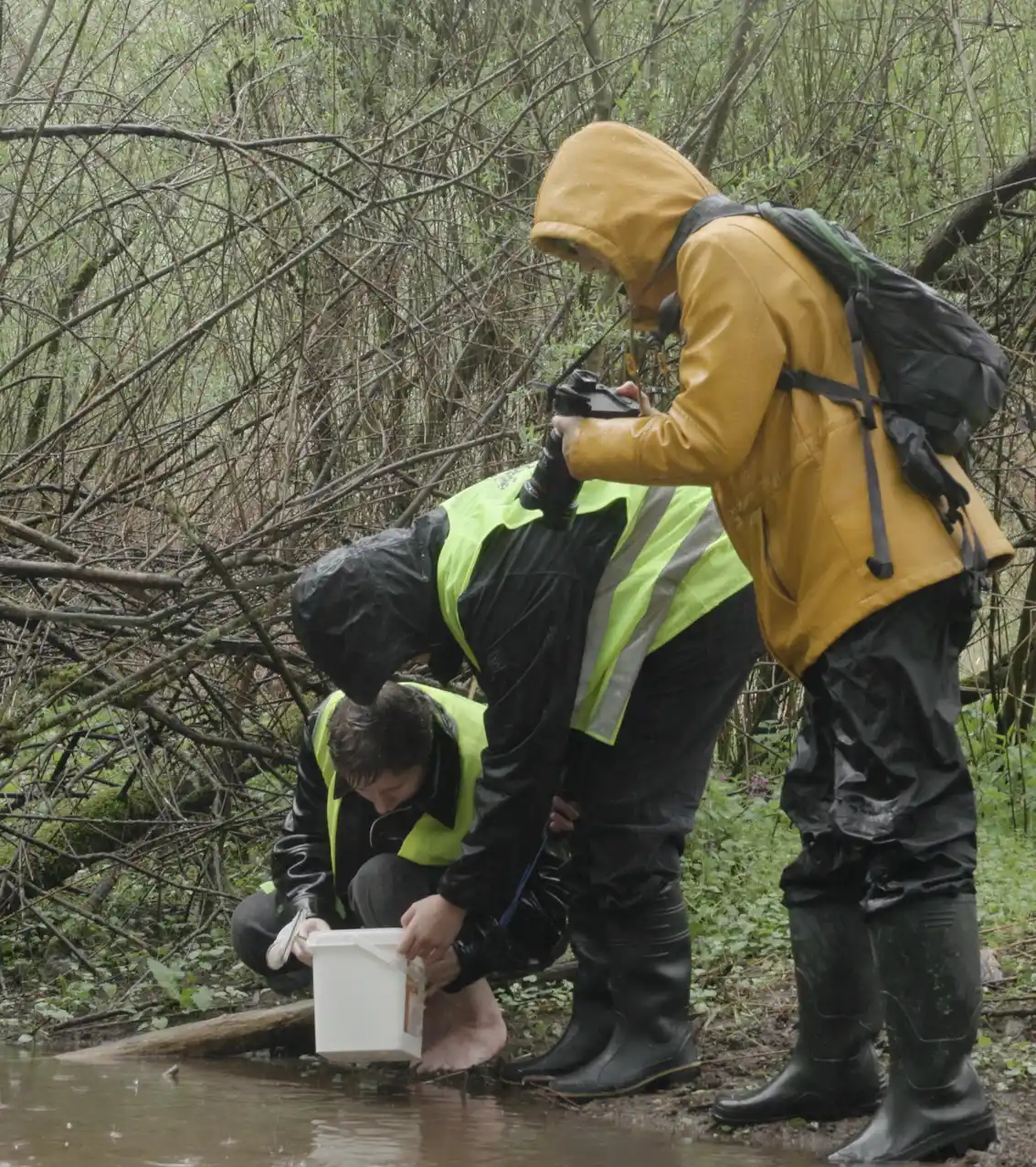 Obwohl das Wetter nicht optimal war, konnten sie dennoch drei Larven für ihr Erhaltungszucht-Projekt entnehmen.